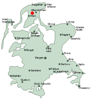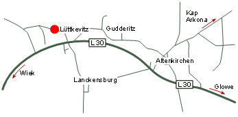 Rechts Richtung Dranske (nach Altenkirchen) > nach Linkskurve und weiteren 50 m in den Feldweg rechts > Haus steht rechts nach ca. 250 m |